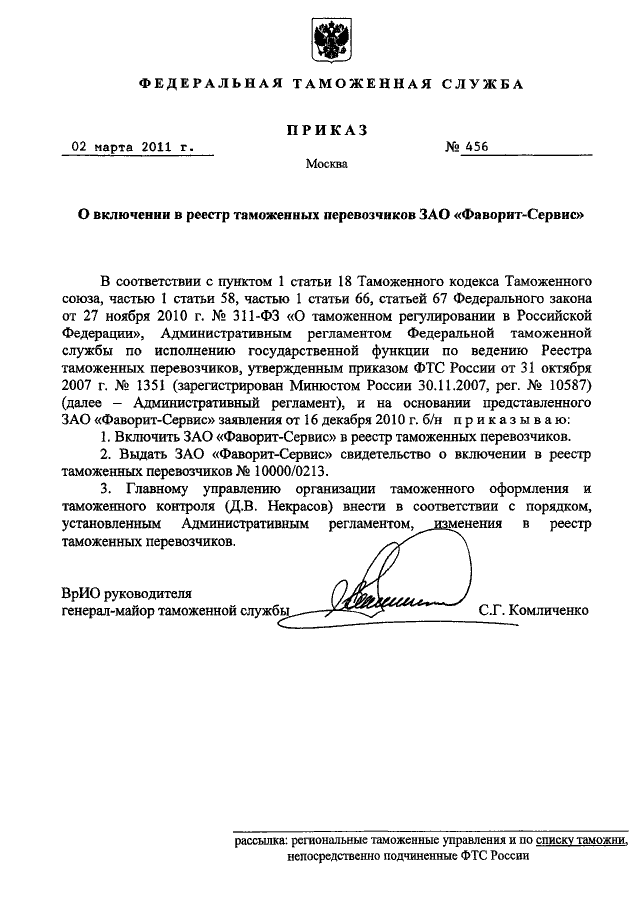 ПРИКАЗ ФТС РФ от 02.03.2011 N 456