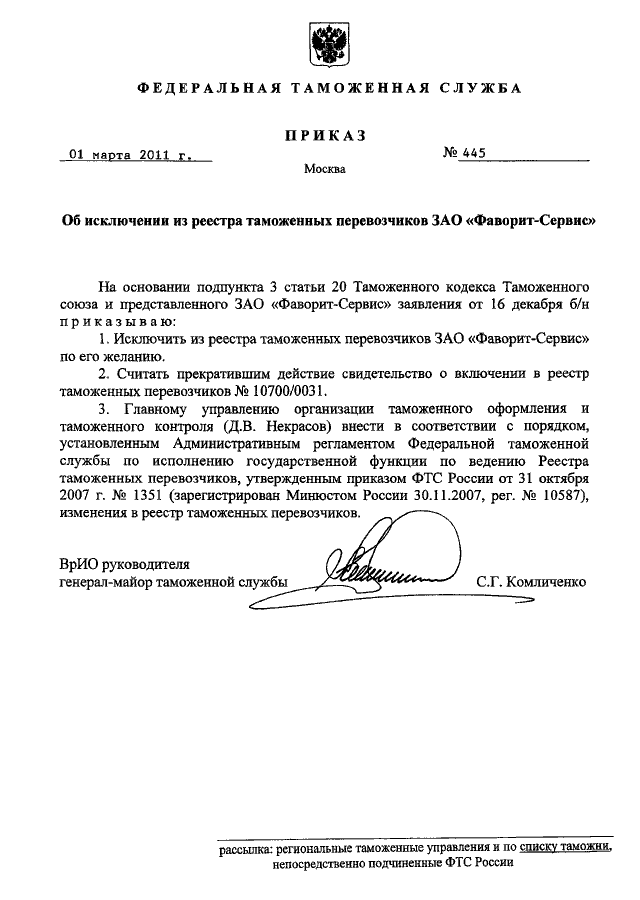 ПРИКАЗ ФТС РФ от 01.03.2011 N 445