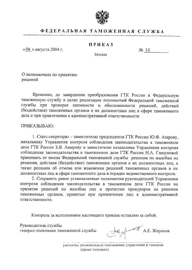 ПРИКАЗ Федеральной таможенной службы от 04.08.2004 N 12
