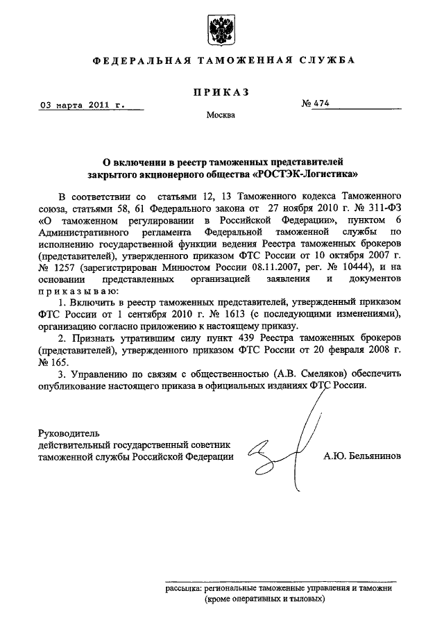 ПРИКАЗ ФТС РФ от 03.03.2011 N 474
