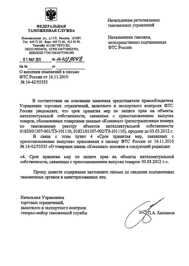 ПИСЬМО ФТС РФ от 01.03.2011 N 14-42/9048