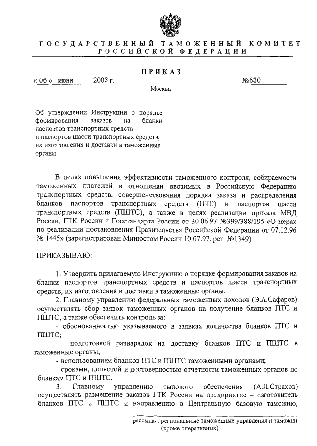 ПРИКАЗ ГТК РФ от 06.06.2003 N 630