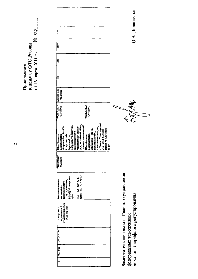 ПРИКАЗ ФТС РФ от 16.03.2011 N 562