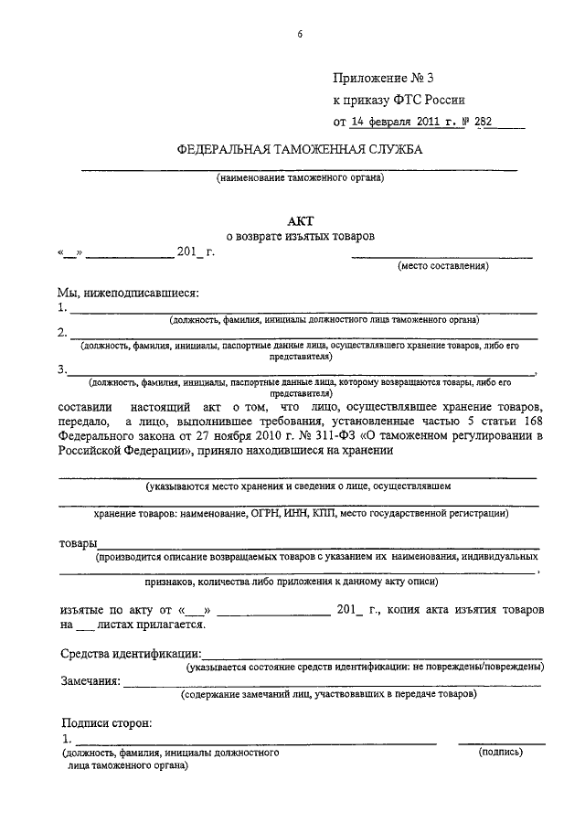 ПРИКАЗ ФТС РФ от 14.02.2011 N 282 "ОБ УТВЕРЖДЕНИИ ФОРМ ПОСТАНОВЛЕНИЯ ТАМОЖЕННОГО ОРГАНА ОБ ИЗЪЯТИИ