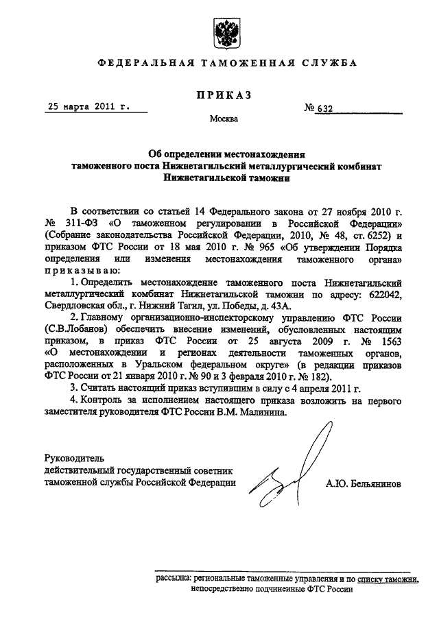 "ОБ ОПРЕДЕЛЕНИИ МЕСТОНАХОЖДЕНИЯ ТАМОЖЕННОГО ПОСТА НИЖНЕТАГИЛЬСКИЙ МЕТАЛЛУРГИЧЕСКИЙ КОМБИНАТ НИЖНЕТАГИЛЬСКОЙ ТАМОЖНИ"