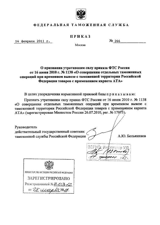 ПРИКАЗ ФТС РФ от 14.02.2011 N 266 "О ПРИЗНАНИИ УТРАТИВШИМ СИЛУ ПРИКАЗА ФТС РОССИИ ОТ 16 ИЮНЯ 2010 Г.