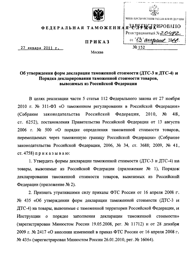 ПРИКАЗ ФТС РФ от 27.01.2011 N 152