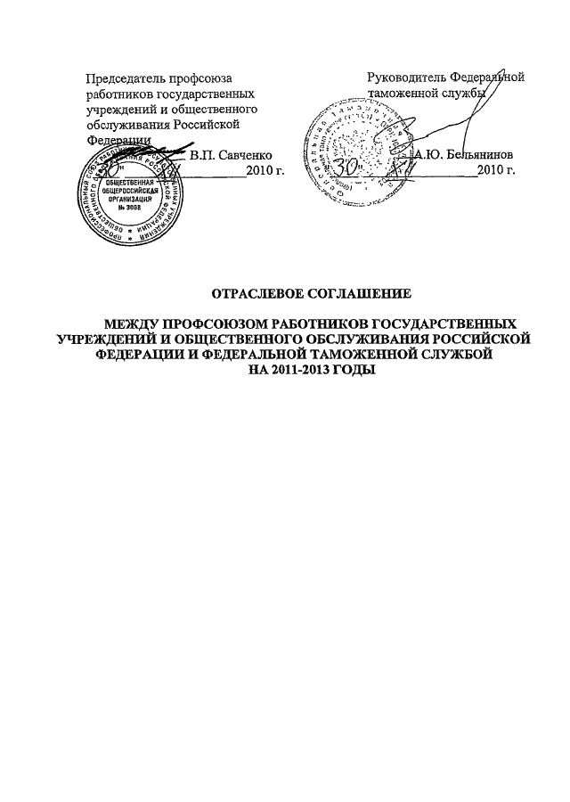 (вместе с "ОТРАСЛЕВЫМ СОГЛАШЕНИЕМ МЕЖДУ ПРОФСОЮЗОМ РАБОТНИКОВ ГОСУДАРСТВЕННЫХ УЧРЕЖДЕНИЙ И ОБЩЕСТВЕННОГО ОБСЛУЖИВАНИЯ РОССИЙСКОЙ ФЕДЕРАЦИИ И ФЕДЕРАЛЬНОЙ ТАМОЖЕННОЙ СЛУЖБОЙ НА 2011 - 2013 ГОДЫ" от 30.12.2010)