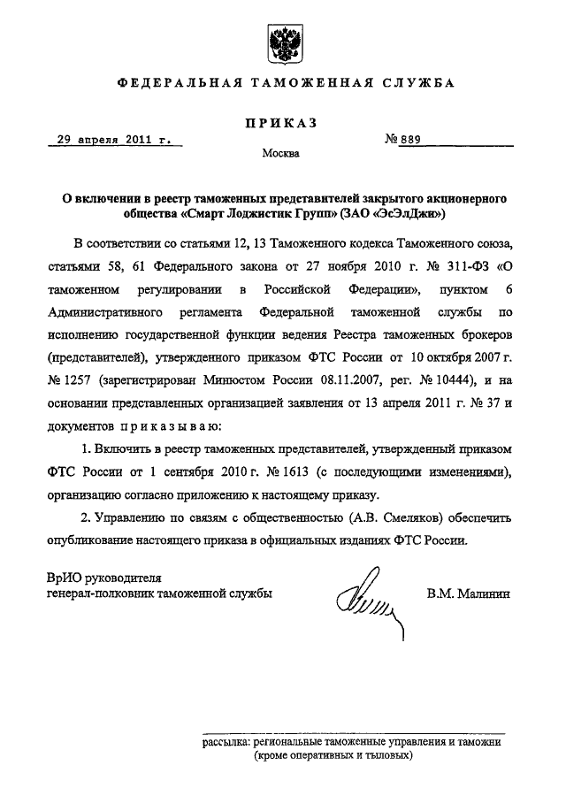ПРИКАЗ ФТС РФ от 29.04.2011 N 889