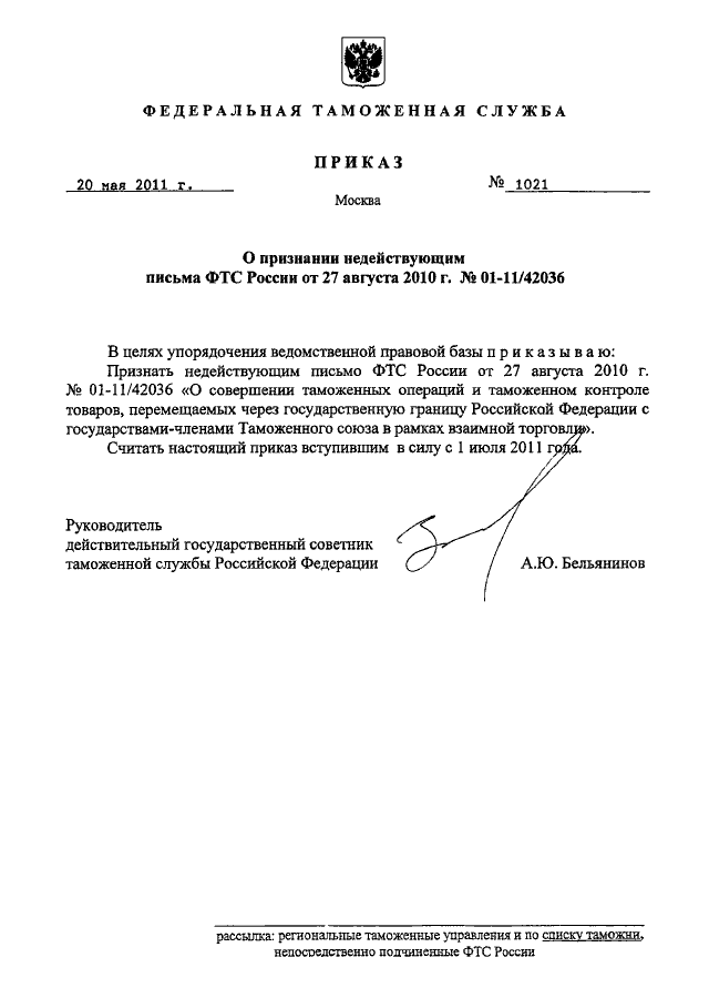 "О ПРИЗНАНИИ НЕДЕЙСТВУЮЩИМ ПИСЬМА ФТС РОССИИ ОТ 27 АВГУСТА 2010 Г. N 01-11/42036"