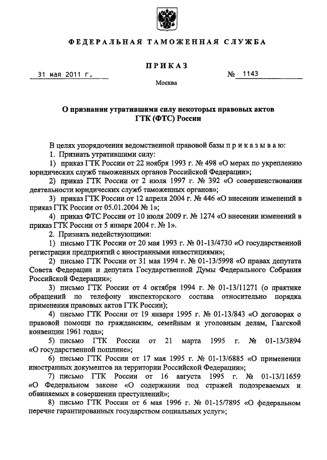 ПРИКАЗ ФТС РФ от 31.05.2011 N 1143