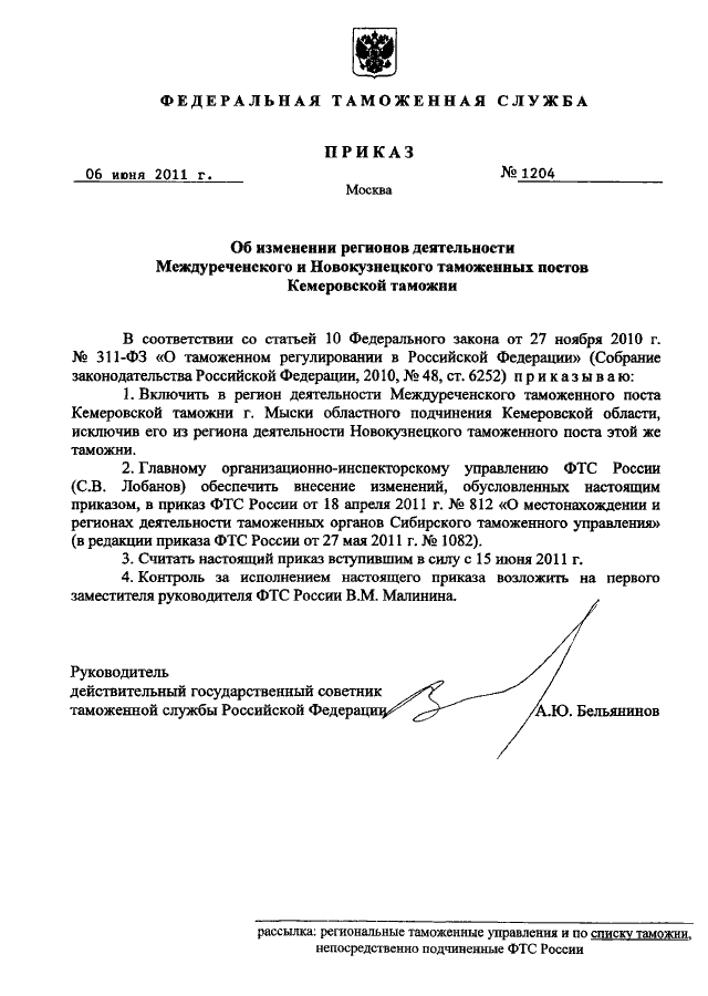 ПРИКАЗ ФТС РФ от 06.06.2011 N 1204