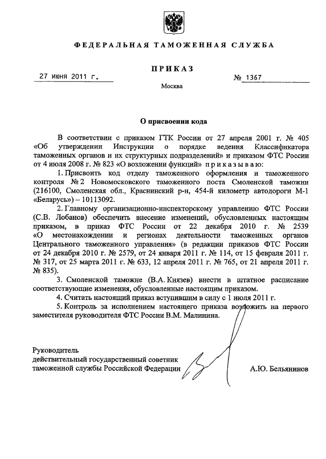 ПРИКАЗ ФТС РФ от 27.06.2011 N 1367