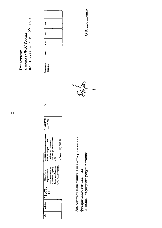 ПРИКАЗ ФТС РФ от 01.07.2011 N 1394