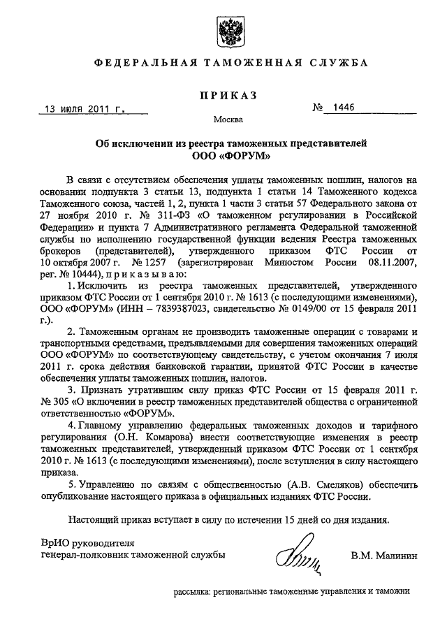 ПРИКАЗ ФТС РФ от 13.07.2011 N 1446
