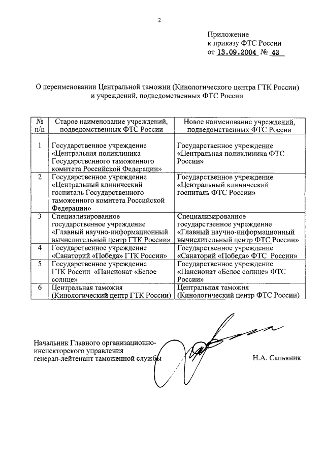 ПРИКАЗ ФТС РФ от 13.09.2004 N 43