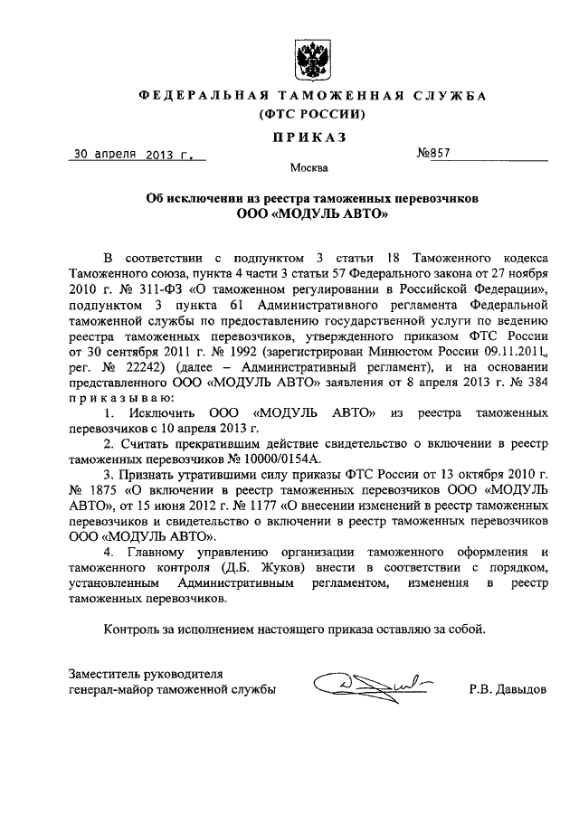 "ОБ ИСКЛЮЧЕНИИ ИЗ РЕЕСТРА ТАМОЖЕННЫХ ПЕРЕВОЗЧИКОВ ООО "МОДУЛЬ АВТО"