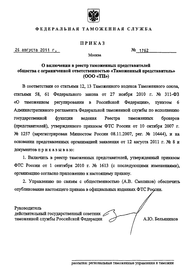 ПРИКАЗ ФТС РФ от 26.08.2011 N 1762