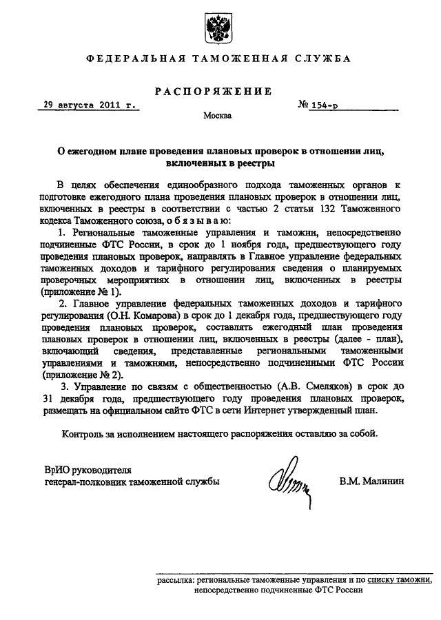 РАСПОРЯЖЕНИЕ ФТС РФ от 29.08.2011 N 154-р