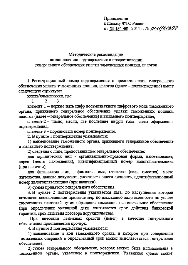 ПИСЬМО ФТС РФ от 30.08.2011 N 01-11/41809