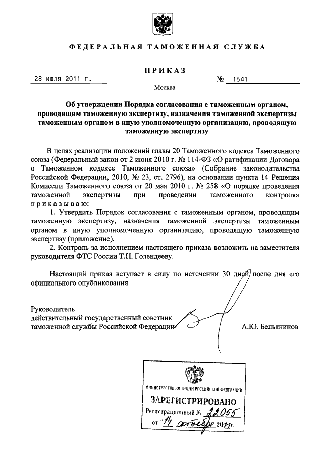 ПРИКАЗ ФТС РФ от 28.07.2011 N 1541