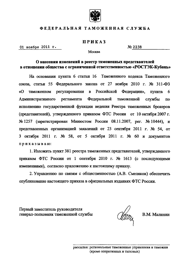 ПРИКАЗ ФТС РФ от 01.11.2011 N 2238