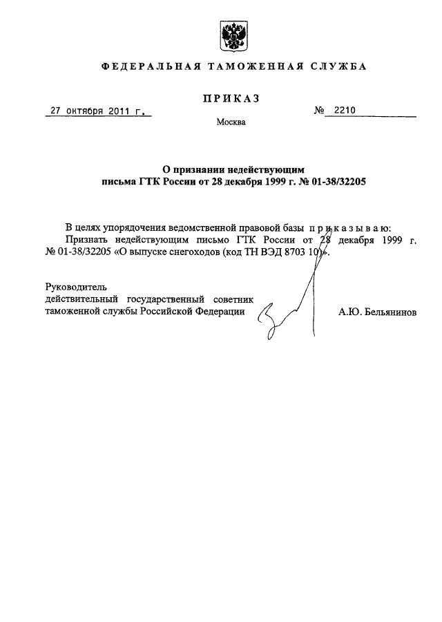 ПРИКАЗ ФТС РФ от 27.10.2011 N 2210