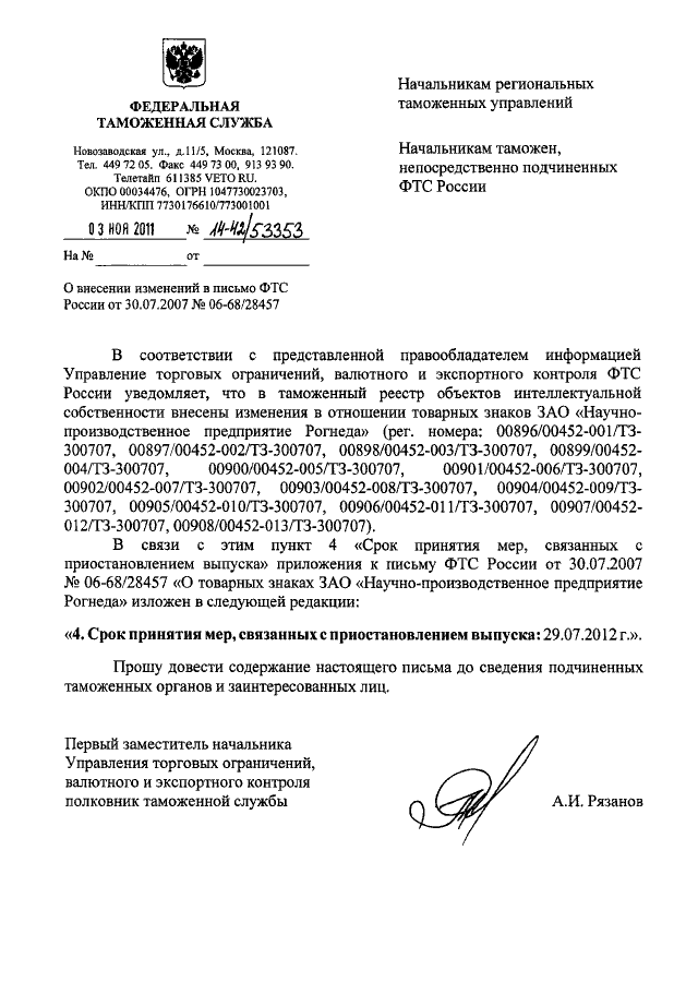 ПИСЬМО ФТС РФ от 03.11.2011 N 14-42/53353