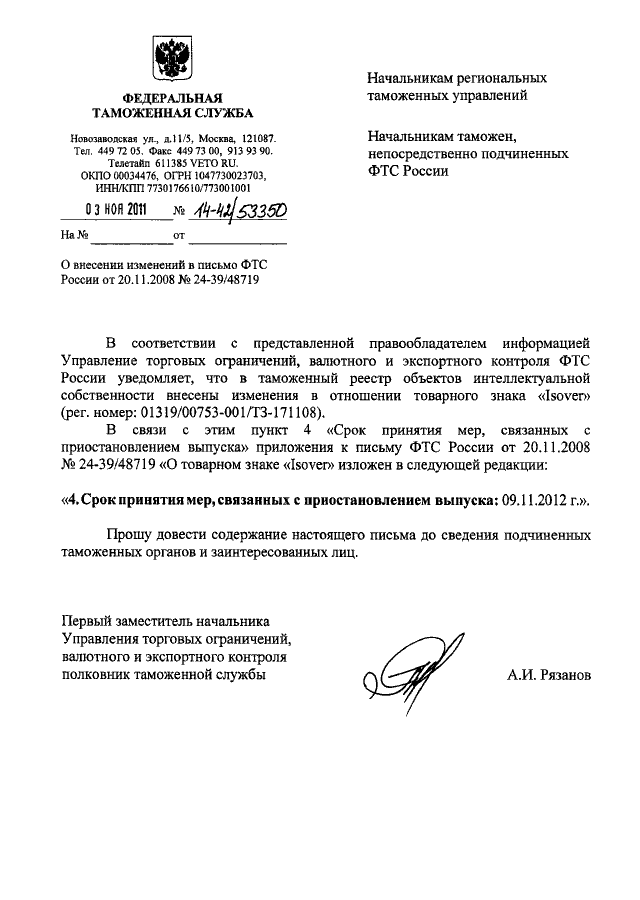 "О ВНЕСЕНИИ ИЗМЕНЕНИЙ В ПИСЬМО ФТС РОССИИ ОТ 20.11.2008 N 24-39/48719"