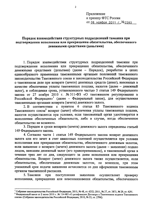 ПРИКАЗ ФТС РФ от 08.11.2011 N 2283