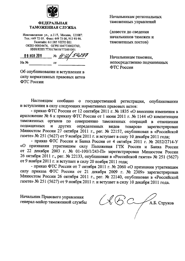 "ОБ ОПУБЛИКОВАНИИ И ВСТУПЛЕНИИ В СИЛУ НОРМАТИВНЫХ ПРАВОВЫХ АКТОВ ФТС РОССИИ"