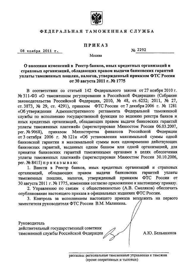 ПРИКАЗ ФТС РФ от 08.11.2011 N 2292