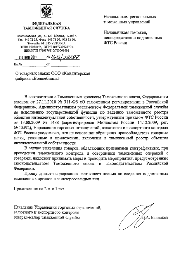 ПИСЬМО ФТС РФ от 30.11.2011 N 14-42/58397