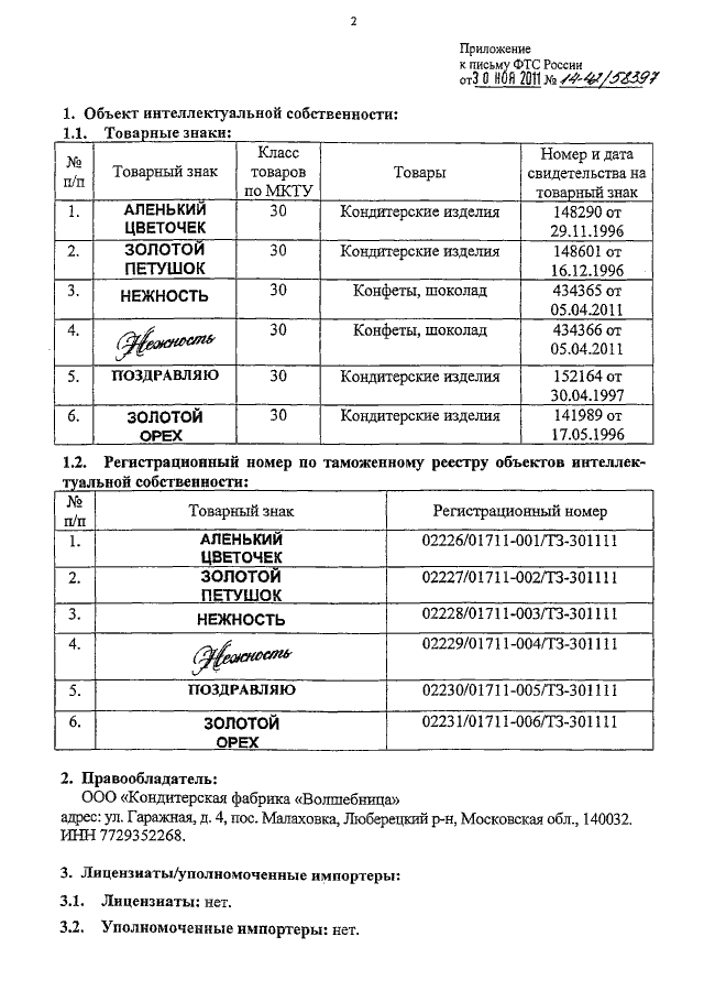 "О ТОВАРНЫХ ЗНАКАХ ООО "КОНДИТЕРСКАЯ ФАБРИКА "ВОЛШЕБНИЦА"