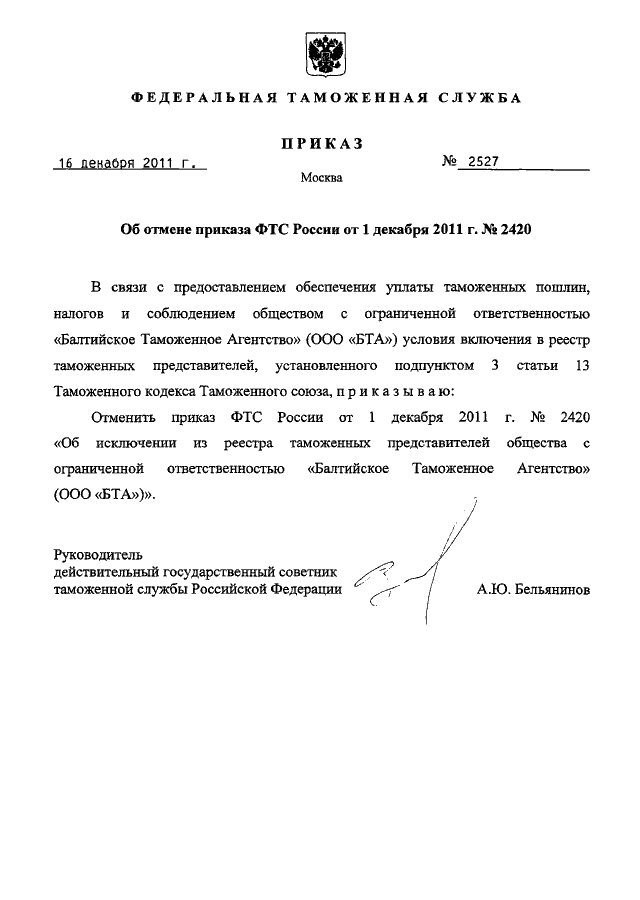 ПРИКАЗ ФТС РФ от 16.12.2011 N 2527