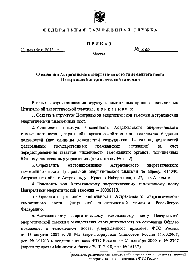 ПРИКАЗ ФТС РФ от 20.12.2011 N 2552