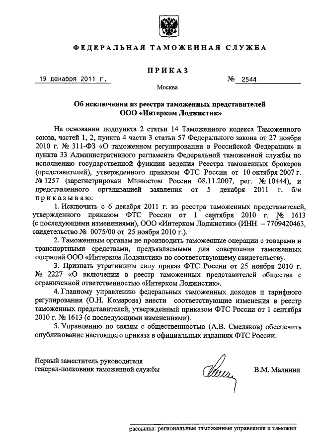 "ОБ ИСКЛЮЧЕНИИ ИЗ РЕЕСТРА ТАМОЖЕННЫХ ПРЕДСТАВИТЕЛЕЙ ООО "ИНТЕРКОМ ЛОДЖИСТИК"