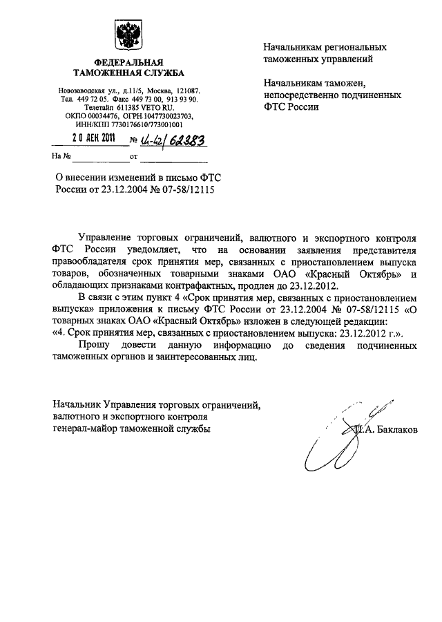 "О ВНЕСЕНИИ ИЗМЕНЕНИЙ В ПИСЬМО ФТС РОССИИ ОТ 23.12.2004 N 07-58/12115"