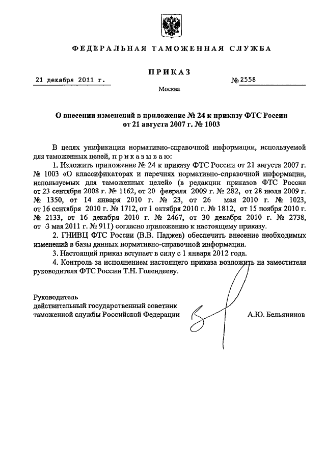 ПРИКАЗ ФТС РФ от 21.12.2011 N 2558