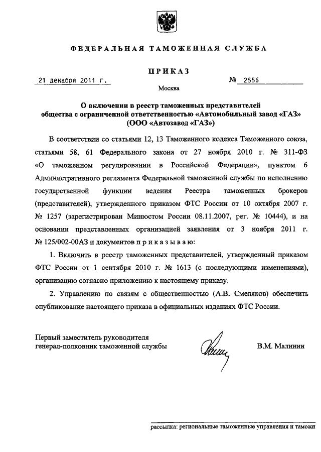 ПРИКАЗ ФТС РФ от 21.12.2011 N 2556