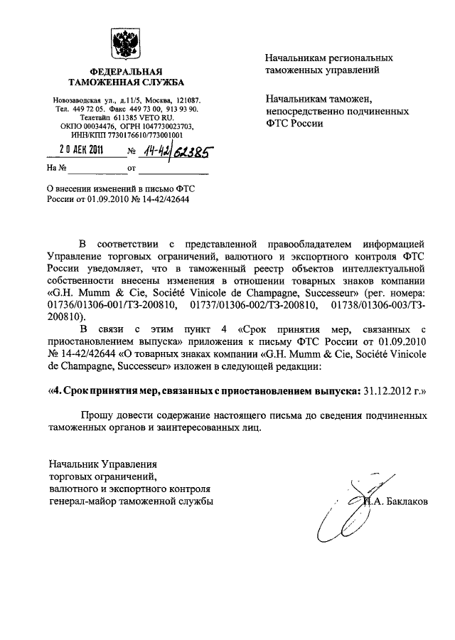 ПИСЬМО ФТС РФ от 20.12.2011 N 14-42/62385