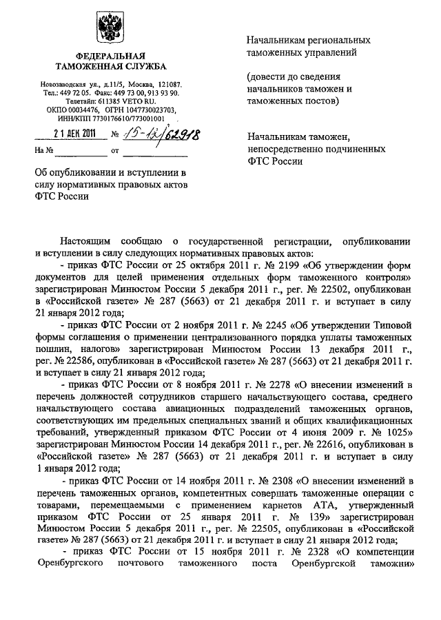 ПИСЬМО ФТС РФ от 21.12.2011 N 15-12/62918