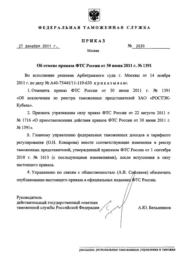 ПРИКАЗ ФТС РФ от 27.12.2011 N 2620