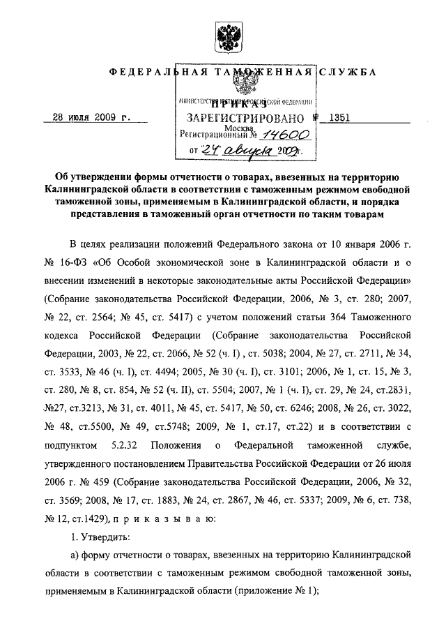 ПРИКАЗ ФТС РФ от 28.07.2009 N 1351 "ОБ УТВЕРЖДЕНИИ ФОРМЫ ОТЧЕТНОСТИ О ТОВАРАХ, ВВЕЗЕННЫХ НА