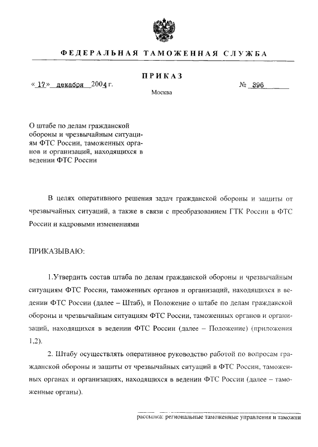 ПРИКАЗ ФТС РФ от 17.12.2004 N 396