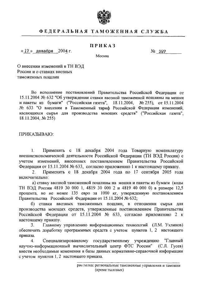 ПРИКАЗ ФТС РФ от 17.12.2004 N 397