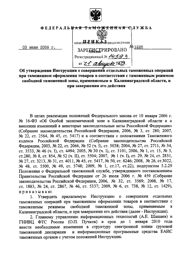 ПРИКАЗ ФТС РФ от 03.07.2009 N 1226
