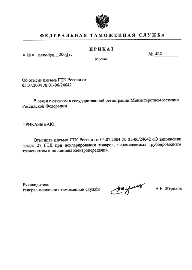 ПРИКАЗ ФТС РФ от 29.12.2004 N 452