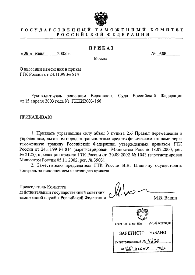 ПРИКАЗ ГТК РФ от 06.06.2003 N 635