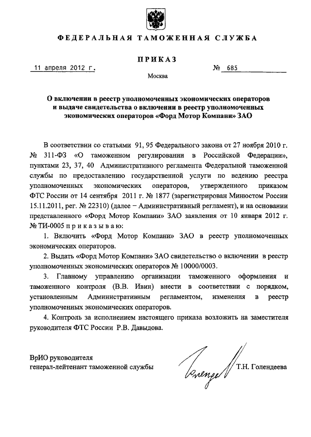 "О ВКЛЮЧЕНИИ В РЕЕСТР УПОЛНОМОЧЕННЫХ ЭКОНОМИЧЕСКИХ ОПЕРАТОРОВ И ВЫДАЧЕ СВИДЕТЕЛЬСТВА О ВКЛЮЧЕНИИ В РЕЕСТР УПОЛНОМОЧЕННЫХ ЭКОНОМИЧЕСКИХ ОПЕРАТОРОВ "ФОРД МОТОР КОМПАНИ" ЗАО"